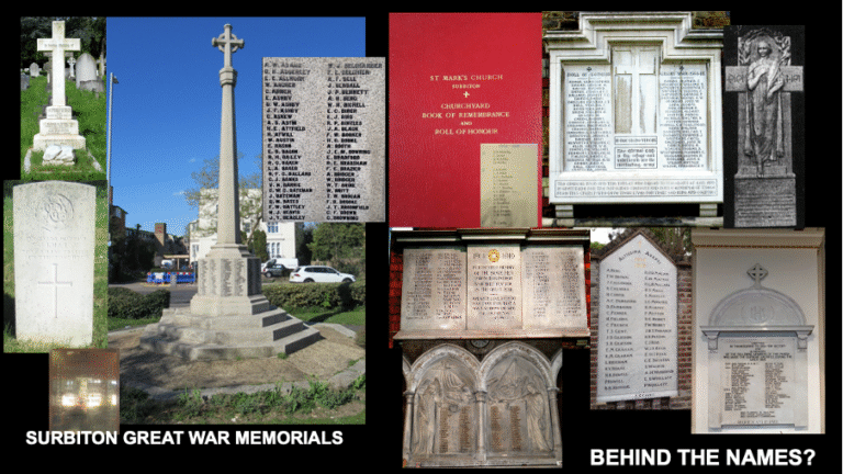This is a PowerPoint Notes presentation based on a talk given to the Surbiton & District Historical Society on 7 October 2025 and it incorporates comments made during the discussion thereafter. The talk was based on research on the following war memorials of the Great War in Surbiton: St Raphael’s Church [KT1 2NA], St Mark’s Church [KT6 4LS], St Andrew’s Church [KT6 4DS, Surbiton Hill Methodist Church [KT6 6AF], Christ Church [KT6 8JJ] and Shrewsbury House Preparatory School [KT6 6RL]. It also considers the memorial that existed in Surbiton Park Congregational Church, demolished in the late 1960s, the Commonwealth War Graves Commission burials in Surbiton Cemetery [KT6 6AG], other Great War graves in this Cemetery and the Surbiton UDC Memorial, also known as “Surbiton Cross” [KT6 6AG]. How the lists of names on the memorials were drawn up is considered and looking behind them provided a glimpse into the lives and deaths of a lost generation of some residents of the Surbiton area and the different social classes that could be identified. The Great War casualties, in different combat zones, were on an unprecedented scale, including civilian non-combatant deaths, and caused an influx of Belgian refugees to the UK, some of whom were accommodated in the Surbiton area. The conflict introduced new methods of warfare, including air combat, long-distance bombardment, and poison gas. All of these added to the old risks of warfare: being killed by the enemy and disease. An emergent disease, “Spanish Influenza”, raged during 1918 – 1920, and some names on the Surbiton memorials reflect this. More information on the memorials can be found on www.kingstonhistoryresearch.co.uk